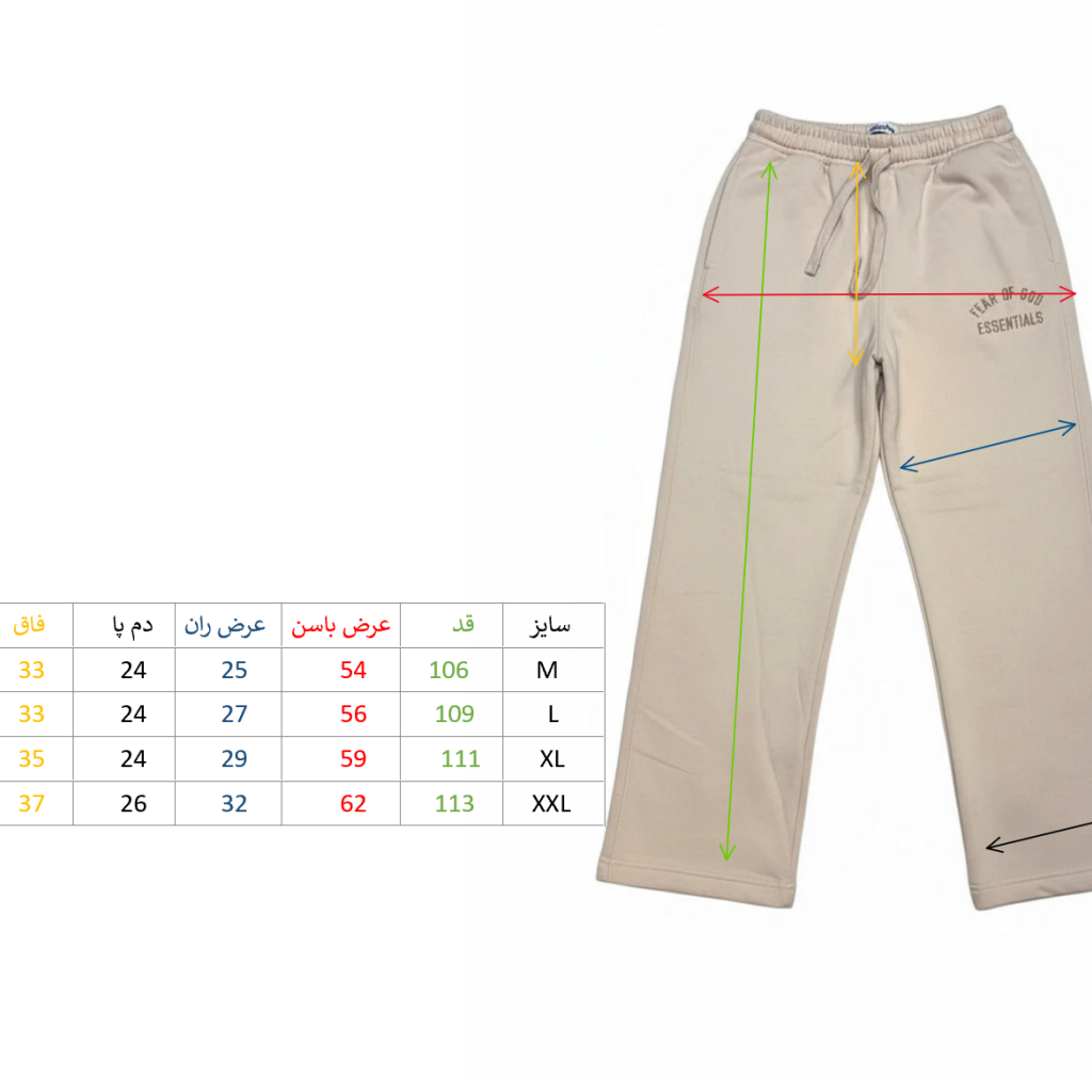 شلوار اسلش بگ Essentials، نماد راحتی و استایل کژوال، با استفاده از پارچه باکیفیت دورس سه نخ پنبه تولید شده است که نرمی، دوام و تنفسپذیری عالی را تضمین میکند.